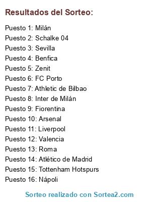 Lista de participantes: Sevilla, Benfica, Zenit, Atlético de Madrid, Schalke 04, Liverpool, Tottenham Hotspurs, Athletic de Bilbao, FC Porto, Fiorentina, Inter de Milán, Milán, Nápoli, Roma, Valencia, Arsenal.