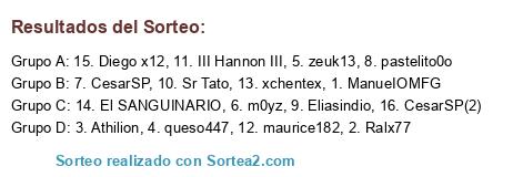 Lista de participantes: 1. ManueIOMFG, 2. Ralx77, 3. Athilion, 4. queso447, 5. zeuk13, 6. m0yz, 7. CesarSP, 8. pastelito0o, 9. Eliasindio, 10. Sr Tato, 11. III Hannon III, 12. maurice182, 13. xchentex, 14. El SANGUINARIO, 15. Diego x12, 16. CesarSP(2).