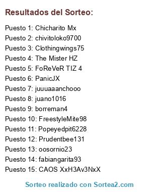 Lista de participantes: FreestyleMite98, Clothingwings75, Prudentbee131, fabiangarita93, juano1016, Chicharito Mx, FoReVeR TIZ 4, PanicJX, The Mister HZ, CAOS XxH3Av3NxX, borreman4, juuuaaanchooo, chivitoloko9700, Popeyedpit6228, oosornio23.