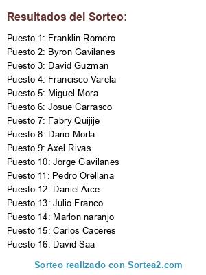 Lista de participantes: Francisco Varela, Pedro Orellana, Carlos Caceres, Fabry Quijije, Jorge Gavilanes, Julio Franco, Axel Rivas, David Guzman, Miguel Mora, David Saa, Franklin Romero, Dario Morla, Marlon naranjo, Josue Carrasco, Byron Gavilanes, Daniel Arce.