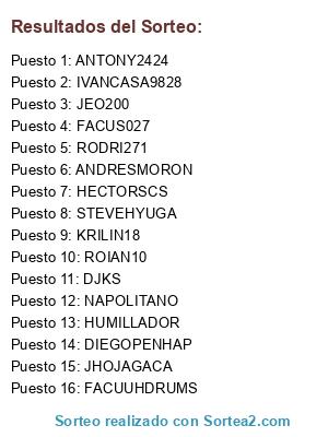 Lista de participantes: DJKS, HUMILLADOR, RODRI271, ANTONY2424, JEO200, ROIAN10, NAPOLITANO, JHOJAGACA, DIEGOPENHAP, FACUS027, IVANCASA9828, FACUUHDRUMS, STEVEHYUGA, ANDRESMORON, KRILIN18, HECTORSCS.