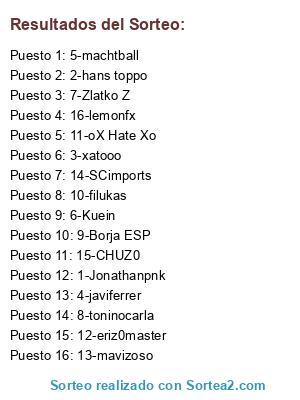 Lista de participantes: 1-Jonathanpnk, 2-hans toppo, 3-xatooo, 4-javiferrer, 5-machtball, 6-Kuein, 7-Zlatko Z, 8-toninocarla, 9-Borja ESP, 10-filukas, 11-oX Hate Xo, 12-eriz0master, 13-mavizoso, 14-SCimports, 15-CHUZ0, 16-lemonfx.