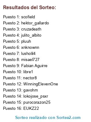 Lista de participantes: lusholil4, hektor_gallardo, WinningElevenOne, nector8, xnknownn, gavohm, EUKZ22, Fabian Aguirre, purocorazon25, misael727, lokojose_psxr, scofield, cruzadeath, pluuh, julito_albito, libre1.