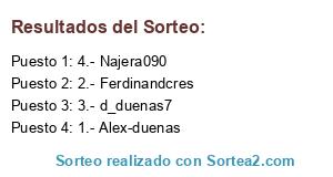 Lista de participantes: 1.- Alex-duenas, 2.- Ferdinandcres, 3.- d_duenas7, 4.- Najera090.
