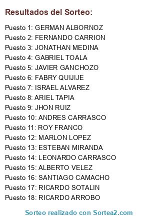 Lista de participantes: FABRY QUIJIJE, ESTEBAN MIRANDA, DANIEL GARRIDO, LEONARDO CARRASCO, ANDRES CARRASCO, FERNANDO CARRION, VICENTE NICOLA, BRYAN CADENA, ALEX HIDALGO, MARLON LOPEZ, GABRIEL TOALA, ANDRES MEDINA, ALBERTO VELEZ, ARIEL TAPIA, GERMAN ALBORNOZ, HENRY GALLO, IRVIN BERMELLO, JAVIER GANCHOZO, JHOEL VEINTIMILLA, JOHAN PADILLA, JONATHAN MEDINA, JUAN SANCHEZ, KELVIN CHAVEZ, MATIAS OCAÑA.