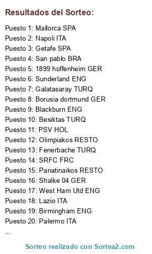 Lista de participantes: Sunderland ENG , Lazio ITA , Birmingham ENG , Fenerbache TURQ , Besiktas TURQ , Borusia dortmund GER , Shalke 04 GER , Napoli ITA , Palermo ITA , Olimpiakos RESTO , Galatasaray TURQ , Getafe SPA , Panatinaikos RESTO, 1899 hoffenheim GER , Mallorca SPA, Losc Lille FRC, RC Deportivo lacoruna SPA , San pablo BRA , PSV HOL, Blackburn ENG, Inter Porto Alegre BR , SRFC FRC , West Ham Utd ENG , C Sao Paolo (Corinthians).