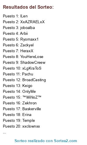 Lista de participantes: iFaccu, xLgKraToS, Pachu, Ivanloki, HeraxX, Caliz, Ulisse, BroadCasting, YouHereLose, ™MiNoZ™, Zackyel, OnlyMe, Baskerville, SpOuL, Zekhron, Temple, Keigo, ShadowCreew, XxAnDrEexX, Soultaker, Arbii, Tsquare, NeOxNoaH, XxAZRAELxX, DarkPrincesS, joboalba, Lokillo07, lLen, Erina, xxclownxx, kendalito, Ryomaxx1.
