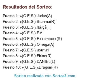 Lista de participantes: »)G.E.S(«Brahma(R), »)G.E.S(«DANIEL(L), »)G.E.S(«Dragom(R), »)G.E.S(«EMI, »)G.E.S(«Extremexxx(R), »)G.E.S(«Firion(R), »)G.E.S(«Judas(A), »)G.E.S(«Omega(A), »)G.E.S(«ßårçå(T), »)G.E.S(«иou^и1.