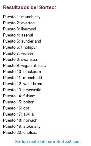 Lista de participantes: a.villa, asenal, blackburn, bolton, chelsea, everton, fulham, liverpool, manch.city, manch.utd, newcastle, norwich, qpr, stoke sity, sunderland, swansea, t.hotspur, west brom, wigan athletic, wolves.