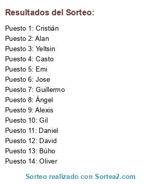 Lista de participantes: Alan, Alexis, Ángel, Búho, Casto, Cristián, Daniel, David, Gil, Guillermo, Jose, Yeltsin, Emi, Oliver.