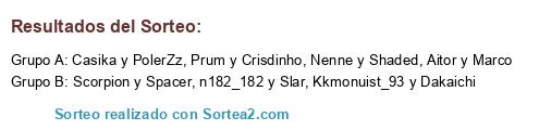 Lista de participantes: Aitor y Marco, Nenne y Shaded, n182_182 y Slar, Prum y Crisdinho, Scorpion y Spacer, Casika y PolerZz, Kkmonuist_93 y Dakaichi.