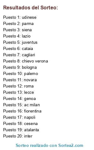 Lista de participantes: ac milan, atalanta, bologna, cagliari, cataia, cesena, chievo verona, fiorentina, genoa, inter, juventus, lazio, lecce, napoli, novara, palemo, parma, roma, siena, udinese.