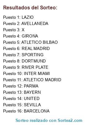 Lista de participantes: LAZIO, GIRONA, ATLETICO MADRID, AVELLANEDA, REAL MADRID, BAYERN, ATLETICO BILBAO, SPORTING, DORTMUND, PARMA, UNITED, SEVILLA, BARCELONA, INTER MIAMI, RIVER PLATE, X.