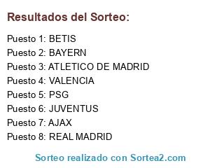 Lista de participantes: AJAX, BAYERN, ATLETICO, MADRID, BARCELONA, VALENCIA, BETIS, PSG, ROMA, CELTA, MALAGA, MONACO, VILLARREAL, JUVENTUS.