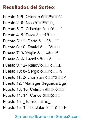 Lista de participantes: *Mánager Segunda Liga*, _Torneo latino_, 1- The Jako 🇨🇱, 2- Jhonatan 🇺🇾, 3- Yoglin 🇻🇪, 4- Hernán 🇦🇷, 5- Daza 🇧🇴, 6- Nico 🇪🇸, 7- Cristhian 🇨🇴, 8- Sergio 🇲🇽, 9- Orlando 🇲🇽, 10- Andrés 🇵🇾, 11- Darío 🇪🇨, 12- Randy 🇨🇱, 13- Cristian 🇦🇷, 14- Carlos 🇦🇷, 15- Celman 🇧🇴, 16- Daniel 🇨🇱.