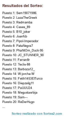 Lista de participantes: RoksaCZV22, W-jorcha-W, LazaTheGreek, Ekoh, PataNegra7, AlonsoGrayFox, Sam---, ReDerHugo, Barboza12_, B10_joker, Teclis-88, Cases_89, Joanfcb, Redmamba, PhaNtOm_Duck-95, Payamjoon69, Diepzalig11, Abrahamm0726, PaUUU24, Young_Pro97, Imbaedo1, Fetih1453ElTurco, Erkobra18, Sem19071986, Ferran8r, Megustasrbija, Pipol-Imperador, INDOJAWA, AndreBBV94, JC_STUNNER_90, S-Venom, Mucahit12.