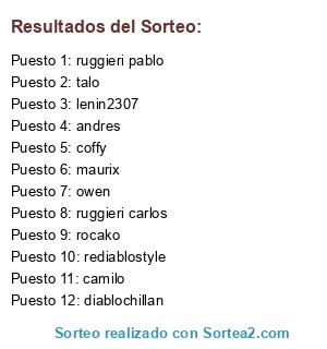 Lista de participantes: rocako, diablochillan, rediablostyle, lenin2307, maurix, ruggieri pablo, ruggieri carlos, camilo, coffy, owen, talo, andres.