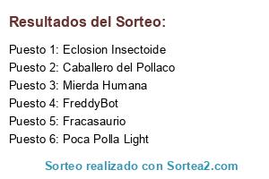 Lista de participantes: Mierda Humana, Fracasaurio, Eclosion Insectoide, Poca Polla Light, FreddyBot, Caballero del Pollaco.