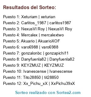 Lista de participantes: NexusVI Roy | NexusVI Roy, Tito28850 | tit28850, Xx_Pichu_xX | XxPichu39xX, Akuario | AkuarioXOF, KEYZMUZ | KEYZMUZ, gonzalonbc | gonzapichi11, Xeturiam | xeturian, Mercalex | mercalextwo, Ivanescense | Ivanescense, Carlitos_1987 | carlitos1987, Danyfuenla82 | Danyfuenla82.