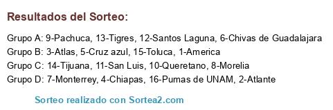 Lista de participantes: 1-America, 2-Atlante, 3-Atlas, 4-Chiapas, 5-Cruz azul, 6-Chivas de Guadalajara, 7-Monterrey, 8-Morelia, 9-Pachuca, 10-Queretano, 11-San Luis, 12-Santos Laguna, 13-Tigres, 14-Tijuana, 15-Toluca, 16-Pumas de UNAM.