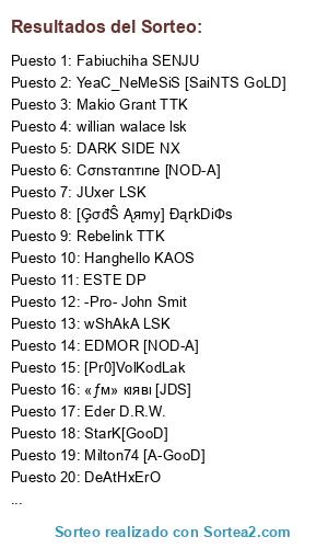 Lista de participantes: King_Arthur -SVyM-, [Pr0]VolKodLak, [ĢσđŜ Ąяmy] ÐąгkDiФѕ, YeaC_NeMeSiS [SaiNTS GoLD], Milton74 [A-GooD], Hanghello KAOS, EDMOR [NOD-A], ESTE DP, JUxer LSK, Redprotector Ryp-Nax, -Pr0- Renox, willian walace lsk, DeAtHxErO, Makio Grant TTK, Calvoy NX, [DP] Horus, Cσnsтαnтιne [NOD-A], Fabiuchiha SENJU, wShAkA LSK, DARK SIDE NX, kirptonite Akatsuki, Felix D Ace {DP}, Sasuke Hyuuga, StarK[GooD], «ƒм» кιявι [JDS], Rebelink TTK, Eder D.R.W., Monkey D. Luffy TTK, -PrO- Kiryu, -Pro- John Smit.