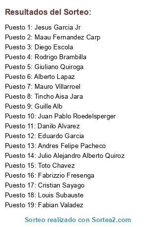Lista de participantes: Alberto Lapaz, Fabrizzio Fresenga, Cristian Sayago, Fabian Valadez, Andres Felipe Pacheco, Julio Alejandro Alberto Quiroz, Juan Pablo Roedelsperger, Louis Subauste, Maau Fernandez Carp, Giuliano Quiroga, Mauro Villarroel, Guille Alb, Tincho Aisa Jara, Diego Escola, Eduardo Garcia, Rodrigo Brambilla, Jesus Garcia Jr, Toto Chavez, Danilo Alvarez.