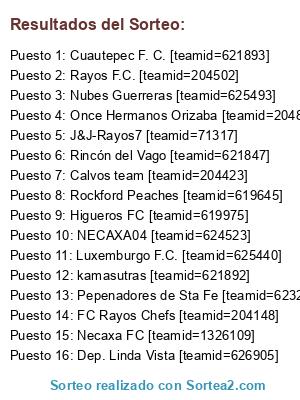 Lista de participantes: Nubes Guerreras [teamid=625493], Pepenadores de Sta Fe [teamid=623205], Rockford Peaches [teamid=619645], Higueros FC [teamid=619975], NECAXA04 [teamid=624523], Calvos team [teamid=204423], Dep. Linda Vista [teamid=626905], Rayos F.C. [teamid=204502], Luxemburgo F.C. [teamid=625440], Once Hermanos Orizaba [teamid=204827], FC Rayos Chefs [teamid=204148], kamasutras [teamid=621892], Cuautepec F. C. [teamid=621893], Rincón del Vago [teamid=621847], J&J-Rayos7 [teamid=71317], Necaxa FC [teamid=1326109].