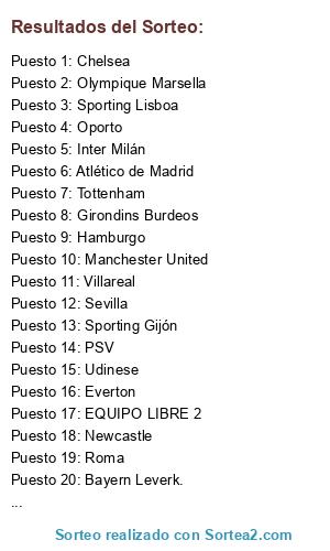 Lista de participantes: Sevilla, Napoles, Manchester United, Fenerbaçhe, Galatasaray, Panathinaikos, Bayern Leverkusen, Bayern Munich, Werder Bremen, Lazio, Betis, Hamburgo, Benfica, Sporting Portugal, Villarreal, Udinese, Olympique Marsella, Newcastle, Stuttgart, PSV, Inter Milán, Chelsea, Everton, Roma, Oporto, Barcelona, Sporting Gijon, Girondins Burdeos, Tottenham, Atlético de Madrid, Equipo libre 1, Equipo libre 2.