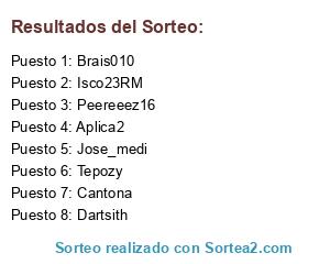 Lista de participantes: Cantona, Dartsith, Isco23RM, Aplica2, Brais010, Tepozy, Jose_medi, Peereeez16.