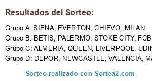 Lista de participantes: ALMERIA, NEWCASTLE, CHIEVO, BETIS, STOKE CITY, QUEEN, UDINENSE, FCB, VALENCIA, SIENA, MILAN, DEPOR, MADRID, PALERMO, LIVERPOOL, EVERTON.