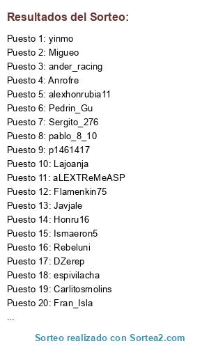 Lista de participantes: alexhonrubia11, Honru16, Flamenkin75, Fran_Isla, Lajoanja, Rebeluni, DZerep, Migueo, Miguelinho14_, Pakarda4, Anrofre, pablo_8_10, Boliflay8, Ismaeron5, Pedrin_Gu, Carlitosmolins, Vicentillo15, Javjale, ander_racing, yinmo, aLEXTReMeASP, espivilacha, Sergito_276, RgrPrz, p1461417.