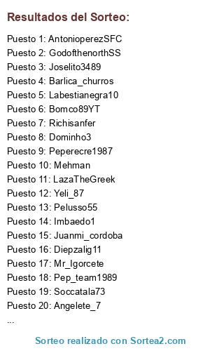 Lista de participantes: PaUUU24, Labestianegra10, SORAK_PRO, Juanmi_cordoba, Richisanfer, Yiou13, Lolito22, W-jorcha-W, Cariddean_69, Marlito12, Pipol-Imperador, Mokispucela, WEIOS, Bomco89YT, Mistycbox, Lps_bruninhuh66, Wantxope9, Fer_Don3p, Ekoh, LazaTheGreek, Albertomaliyo, Luis__pa, GodofthenorthSS, AntonioperezSFC, Kamisama_1095, Maskyrojillo, Pinchorevoleras, Angeltotote, Mehman, gutista-14-, Dominho3, JUANCARLOSRIVA, Sem19071986, Flusherush, Kailovic, Farbax, ALvarofresco, Abrahamm0726, Boixos_nois186, Peperecre1987, Young_pro97, Julio_pocho, B10_joker, Tililis, Guille_LM, Agresivo100, Agustiko, C4risttian, Rafanapes, LimbergAVM, Diepzalig11, Killtony9, Troyanitooo999, Pablocusan, barboza12_, Chec_CheLLioS, Kvothe_the_hero, Amortee, Javitri, Yeli_87, IK791, Soto___11, Tachin_6, gamadrid, Mateocamisa10, Pep_team1989, Caubo12, MeGustaSrbija, Cortex_xx, G66physis666, Tar-Tessian_king, Imbaedo1, CinderellaMan_13, Anquiher, Ferran8r, FrancisFlores7, erkobra18, Golin82, JC_STUNNER_90, RoksaCZV22, Buba_bsj, F4r40n, ALE87_ITA, Agustainer, Adrianmaese, jesure9, jorgelm7, Veldruuk, Dominekong, Xiko7, Mr_Igorcete, Ju20no, KaiSER-SH7, Miguel_Ruano, Twisterswar, Joanfcb, SharkGar06, Sr_Osquitar, Joselito3489, Mallorca_killer9, DAMI_ALMENARA, elcrishiiito99, Piponayara, Reymago11, Cheche19, Rodrigoroig, Pastrakas, Angelete_7, ADumat_6, Enrimabe07, Abforz, Sheriffchenko, AntGragera10, KaseO_crew_, Barlica_churros, Pelusso55, Cases_89, fantastico-1, Vegapes, Hectoryenzo, YakiGames, Elmanue_15, Silva7388, KillerKurgan, Soccatala73, jordigonzalez, Jpf-2009, Delpi_10_.