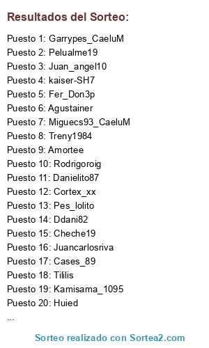 Lista de participantes: Abforz, Radun99, PESD10S, Baricelli, KaseO_crew_, Fer_Don3p, Domenikong, kaiser-SH7, Danielito87, Amortee, M_mestre_, Juancarlosriva, Miguecs93_CaeluM, ALE87_ITA, Pablogar06, Huied, Tetebelda, Alicate9, Peperecre198, Tililis, Agustainer, Rodrigoroig, Pelualme19, antonioperezSFC, Intocable1986, Cortex_xx, Cases_89, Valle__17, Ertortas86, Cheche19, Selinichev, Pes_lolito, Dami_almenara, Tachin_6, AdriOrtiz99, Ferran8r, X-peridtj-X, D4v1d_f3n1x, Menika91, The_palma2, Joselito3489, Jerbaman2, Sefi_GCF, Cipotti, Treny1984, Trammel7, Boixos_nois186, Poyis05_CaeluM, ADumat_6, Rafana, Bcinete, F4r40n1988, RiWiVi, Alberkin, Kamisama_1095, Ddani82, Ruben-94_, Miguel_ruano, Jorgelm7_CaeluM, Garrypes_CaeluM, W-jorcha-W, PataNegra7, IndominatorTV, Juan_angel10.