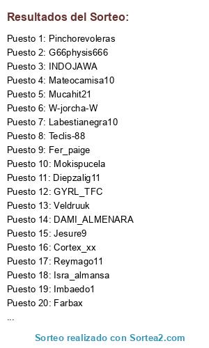 Lista de participantes: INDOMINATOR, Alex209204, JC_STUNNER_90, PaUUU24, MEHMAN__, Mucahit21, No1Pirate, Ekoh, ReDerHugo, Rober_acosta86, AntonioperezSFC, Labestianegra10, B10_joker, Barboza12_, Yiou13, Teclis-88, Christopher_m_m, Ju20no, Diepzalig11, Sam---, PiLuXi90-twitch, LUCLS84, Angel307, gutista-14-, Petros_1610, Mateocamisa10, Elayuwoki11, Lolito_22, Pinchorevoleras, Barlica_churros, ALE87_ITA, Marlito12, gamadrid, Caubo12, fabio__85, xXJujepu93Xx, Guille_Im, Dominho3, Hectoryenzo, Stejinn7, Mallorca_killer9, Mistycbox, Into-__-86, Momojuve_pes-Yt, erkobra18, AlonsoGrayFox, Isra_almansa, Imperador, EJC_21, Abrahamm0726, D3ividESP_, Mauritoqv, GodofthenorthSS, INDOJAWA, SORAK_PRO, Mrsufi_2011, Kampfer555, Cases_89, Lps_bruninhu66, Young_pro97, W-jorcha-W, Ferran8r, Kailovic, Kulecroatia, Joanfcb, Sem19071986, Chev_CheLLioS, JUANCARLOSRIVA, Fer_paige, Jesure9, Mikiteifa10, Farbax, Anquiher, Miguel_Ruano, Malasombra21, Juanmi_Cordobacf, FV_Dementor, Clapped_by_mv, LPS_YellowGirl, PEP_TEAM1989, Kamiikaze26, Vegapes, Agustainer, Imbaedo1, Jock_86, Tachin_6, Reymago11, Javitri, Troyanitooo999, Soto___11, KaseO_crew_, fantastico-1, Kvothe_the_hero, Jorgelm7, Cortex_xx, Kamisama_1095, Veldruuk, KaiSter, ags86zzz, DAMI_ALMENARA, Lakylu, marcosmnc, Catarino_tks, Ivan_madrid23, KaiSER-SH7, Agustiko, Joselito3489, Pelusso55, KRIS_DAM_DAMELLI, Agresivo100, Rubenmartin10, Pelualme19, G66physis666, The_MooD_zWaRa, GYRL_TFC, Rodrigoroig, RoblessGG1, GIIANSS, alenzema, Elcheri81, Mokispucela, Cheche19, amortee, Adry_an12, f4r4on1988, ADumat_6, Satrustegui_69, Sheriffchenko.