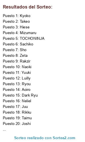 Lista de participantes: Sachiko, Neliel, Rikku, Yuuki, Taimu, Kisho, Dark Ryu, Zeta, Juu, Luilly, Aoiro, Mizumaru, Hiese, Ryou, TOCHONINJA, Takeo, Sho, Naoki, Joshi, Rakzir, Kyoko.