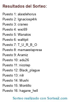 Lista de participantes: Ignaciosp4rk, Montillo, T_U_R_B_O, Wanatos, alasdehorus, Aramiz, Mushi, Black_plague, nilr, wxc69, adu26, nicotep, hagane_hell, walttpit, craneo, mamaestapresa.