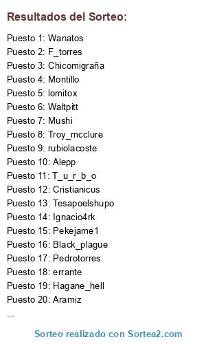 Lista de participantes: Pekejame1, Nicotep, Craneo, Troy_mcclure, Cafran, Mamaestapresa, T_u_r_b_o, Alasdehorus, Mushi, Alepp, Tesapoelshupo, Lalo_lion, Hagane_hell, Chicomigraña, Black_plague, Waltpitt, Druu2merjpax, Ignacio4rk, Antimarioneta, F_torres, Montillo, Ayalaaxx2, Aramiz, Cristianicus, Wanatos, Nilr, Pedrotorres, rubiolacoste, gallardo, errante, tiritoncl, lomitox.