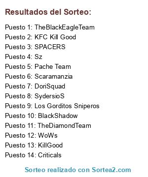 Lista de participantes: WoWs, Scaramazia, TheDiamondTeam, KFC Kill Good, SydersioS, BlackShadow, Pache Team, DoriSquad, Los Gorditos Sniperos, Criticals, SPACERS, TheBlackEagleTeam, Sz, KillGood.