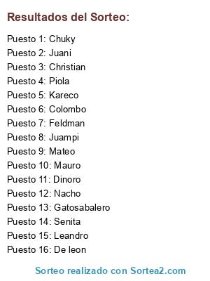 Lista de participantes: Kareco, Leandro, De leon, Christian, Feldman, Piola, Gatosabalero, Colombo, Mateo, Senita, Nacho, Juampi, Dinoro, Chuky, Juani, Mauro.