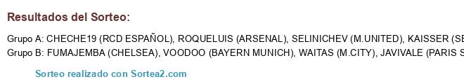 Lista de participantes: CHECHE19 (RCD ESPAÑOL), WAITAS (M.CITY), JAVIVALE (PARIS STG), ROQUELUIS (ARSENAL), FUMAJEMBA (CHELSEA), KAISSER (SEVILLA C.F), SELINICHEV (M.UNITED), VOODOO (BAYERN MUNICH).