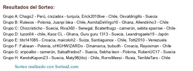 Lista de participantes: KendoKaponi23 - Suecia, maicoloh2 - Suiza, tito141085 - Croacia, Allendinho3 - Chile, Fabiaan - Polonia, Chiccristicho - Suecia, crxzadox - turquía, Juanpi ldea - Chile, luzon04 - chile, RubenUC17 - Suecia, AsmitaDeVirgo10 - Ghana, Osvaldirigillo - Suecia, sebita sparrow - Chile, oHIGHWIZARDo - Dinamarca, Totti2010 - Venezuela, TerribleTaro - Chile, bubudh - Croacia, Bcaterthugz - camerún, Erick2010live - Chile, Rayoxman - Chile, Sebha leon - Polonia, Kaoz CL - Ghana, Riva360 - Senegal, RorroMessi - Rusia, Maty98(tito) - Chile, Chago2 - Perú, Salsalfredoo7 - Suecia, Santiaguinox - Chile, Guru guru 1313 - Suecia, Leandrogaete19 - Japón, xripoalbo - camerún, Rulexos - Polonia.