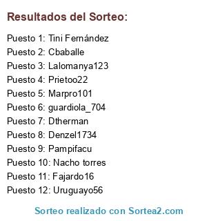 Lista de participantes: Cristián Per, Cbaballe, Lalomanya123, Prietoo22, Marpro101, guardiola_704, Dtherman, Denzel1734, Pampifacu, Nacho torres, Fajardo16, Uruguayo56.