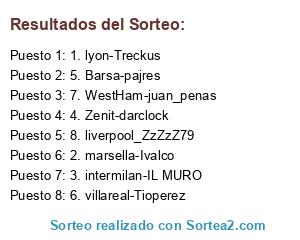 Lista de participantes: 1. lyon-Treckus, 2. marsella-Ivalco, 3. intermilan-IL MURO, 4. Zenit-darclock, 5. Barsa-pajres, 6. villareal-Tioperez, 7. WestHam-juan_penas, 8. liverpool_ZzZzZ79.