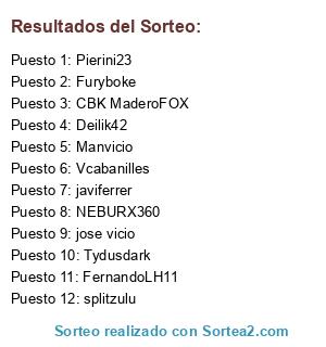 Lista de participantes: Vcabanilles, NEBURX360, jose vicio, Furyboke, CBK MaderoFOX, splitzulu, Manvicio, Deilik42, Tydusdark, Pierini23, FernandoLH11, javiferrer.