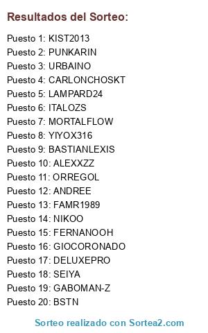 Lista de participantes: ORREGOL, CARLONCHOSKT, SEIYA, PUNKARIN, ANDREE, MORTALFLOW, DELUXEPRO, GIOCORONADO, LAMPARD24, ITALOZS, FAMR1989, BASTIANLEXIS, KIST2013, ALEXXZZ, NIKOO, URBAINO, FERNANOOH, YIYOX316, BSTN, GABOMAN-Z.