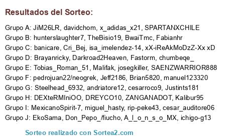 Lista de participantes: davidchom, DEXteRMIniOO, Darkroad2Heaven, Steelhead_6932, Cri_Bej, SAENZWARRIOR888, DREYCO10, BwaiTmc, pedrojuan22/neogrek, hunterslaughter7, Don_Pepo_/fiucho, Malifak, Jeff2186, chumbeqe_, Justints181, A_l_o_n_s_o_MX, Brayanricky, JiM26LR, xX-iReAkMoDzZ-Xx xD, ZANGANADOT, x_adidas_x21, ichigo-g13, andriatore12, Kalibur95, Fabianhr, Brian5820, isa_imelendez-14, Tobias_Roman_51, josegkiller, EkoSama, cesarroco9, miguel_hasty, manuel123320, cesar_auditore06, banicare, MexicanoSpirit-7, Fastorm, rip-peke43, TheBisio19, SPARTANXCHILE.