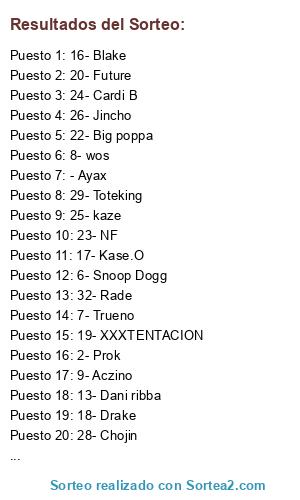 Lista de participantes: 1- Ayax, 2- Prok, 3- Fernando Costa, 4- Canserbero, 5- Natos, 6- Snoop Dogg, 7- Trueno, 8- Wos, 9- Aczino, 10- Chuty, 11- Replik, 12- El menor, 13- Dani ribba, 14- Lit killah, 15- Kid Kei, 16- Blake, 17- Kase.O, 18- Drake, 19- XXXTENTACION, 20- Future, 21- Eminem, 22- Big poppa, 23- NF, 24- Cardi B, 25- Kaze, 26- Jincho, 27- SFDK, 28- Chojin, 29- Toteking, 30- Bejo, 31- Ocer, 32- Rade.