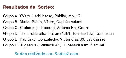 Lista de participantes: Antonio Fa, Toni Bird 33, Lázaro 1361, Hugaso 12, Moi 12, Gonzalucky, The first brotha, Mario, Víctor, Tu pesadilla tm, Roberto, Javigasset, Pablito, Larbi bader, XVaro, Samuel, Carlos mig, Dominican, Pablo, Capitán salami, Germi, Viking1674, Víctor diaz 99, Pablusky.