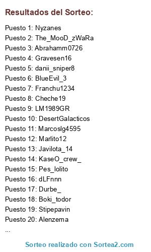 Lista de participantes: Caubo12, PEP_TEAM1989, Young_pro97, Mallorca_killer9, GYRL_TFC, Malasombra21, Marlito12, ADuMat_6, Javilota_14, Wantxope9, Marcoslg4595, Angel307, danii_sniper8, Buba_bsj, Joselito3489, Mokispucela, Peperecre1987, Rachet-_-KING, Alenzema, troyanitooo999, dLFnnn, Durbe_, Kion-_-jr, Mistycbox, KRIS_DAM_DAMELLI, Mehman, Stipepavin, The_MooD_zWaRa, Pad_sergi92, Gravesen16, Chriszurita99, BlueEvil_3, KaseO_crew_, Super__ILO_, F4r4On1988, Pes_lolito, Juan_angel10, Clapped_by_mv, Nyzanes, Victor_olayo, Kvothe_the_hero, Boki_todor, Ra_doc_60, Sr_osquitar, Franchu1234, Ayo_esp, Adry_an12, Anquiher, LorisGambare77o, Abrahamm0726, DesertGalacticos, Chev_CheLLioS_, Roque_luis, Pablocusan, Fer_Don3p, GOOD_O_O, LM1989GR, Cheche19, Menteenferma_10, Dominho3, MaarquezJ, LUCIS84, GoNHix, Jesure9.