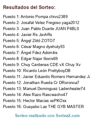 Lista de participantes: Ángęl Zòtó ZOTO7, Alex Razo Rascwacho47, Manuel Dominguez Ladenhealer74, Ángel Fdez Adomitis, Chuy Cardenas CDE vX Chuy Xv, Ricardo León PrettyboyDB, Juan Pablo Duarte JUAN P4BL0, Javier Rs JavhRs, Javier Eduardo Romero Hernandez JavierRomero02, Edgar Najar Iboris69, César Magno dyehuty93, Hector Macias xxPKOxx, Guayabo Laz THE GYB MASTER, Antonio Pompa chivo2389, Josafat Velez Fregoso yaga2012, Jonathan Rueda Cr DRoronoa7.
